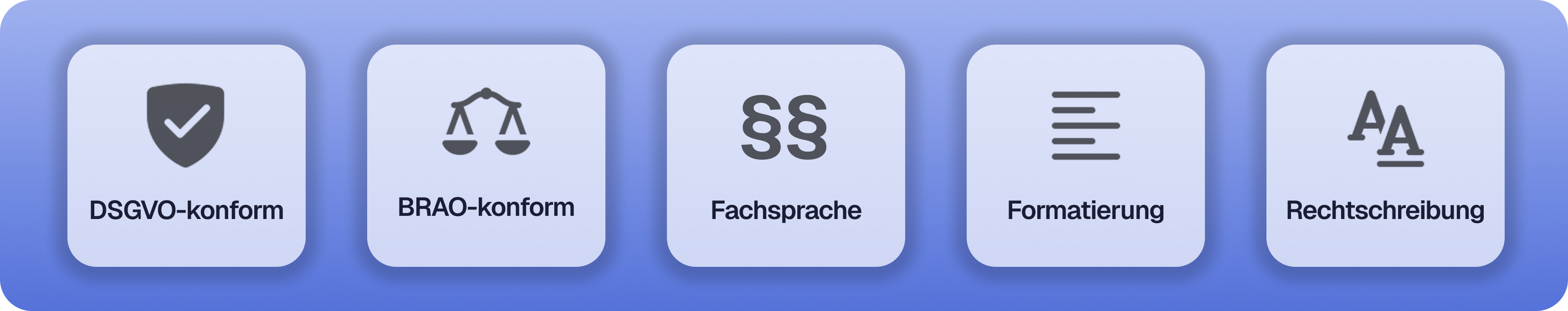 DSGVO-konform, BRAO-konform, Fachsprache, Formatierung, Rechtschreibung